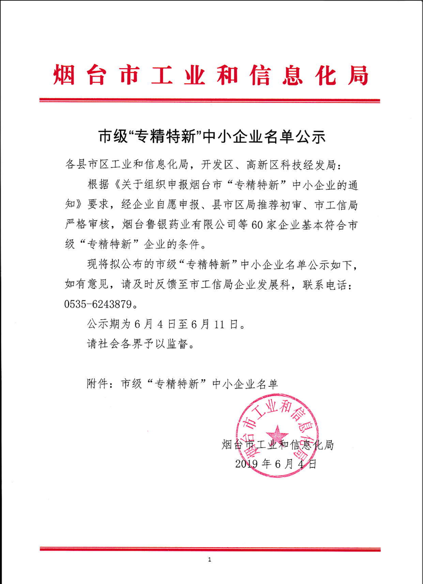 公司榮獲煙臺市”專精特新“中小企業榮譽稱號